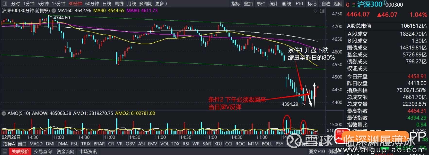(2)明日市场开盘30分钟内,沪深300必须是放量上涨的,成交量必须大于今天,且必须上涨,如果明早开盘出现下跌或者缩量上涨,都不符合触底后反弹的走势,应该立刻卖出,远离不确定风险,继续观望。