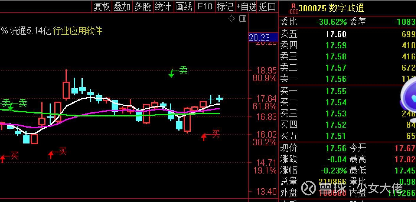 在看$数字政通(SZ300075)$ 首先从系统看他没有形成突破17.3的压力,这里都不算压力了,就是短期还不够强势,没有大启动而已,但是你不能说他不行,环境配合,或者主力牛逼这里是有机会给你起来的就是需要一个放量的阳线去带动起来,看系统价格只要在白线和紫线上方运行都还是强势的格局,这也是我一直还没出的原因!至于我拿不拿等不等,那就看我心情咯!