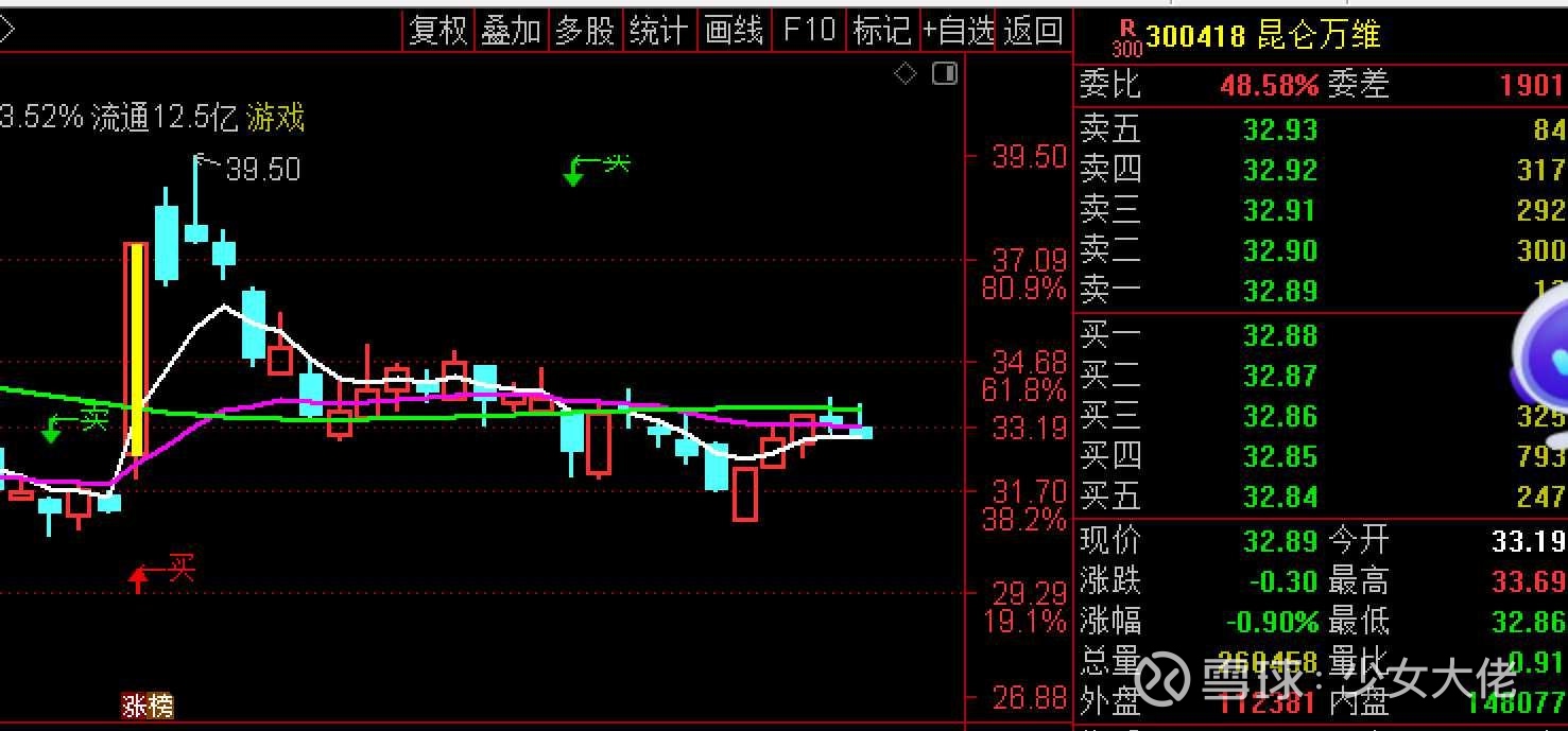 $昆仑万维(SZ300418)$ 这个就差点意思了,这个当时买他是因为前面的涨停回踩,结果人家就是不争气,也不怪他,不是每个主力都是有实力的,看系统价格不突破绿色线那么短期不会改变弱势的格局,突破了才有扭转乾坤那一说,说才主力窝囊还要带上我一起废。