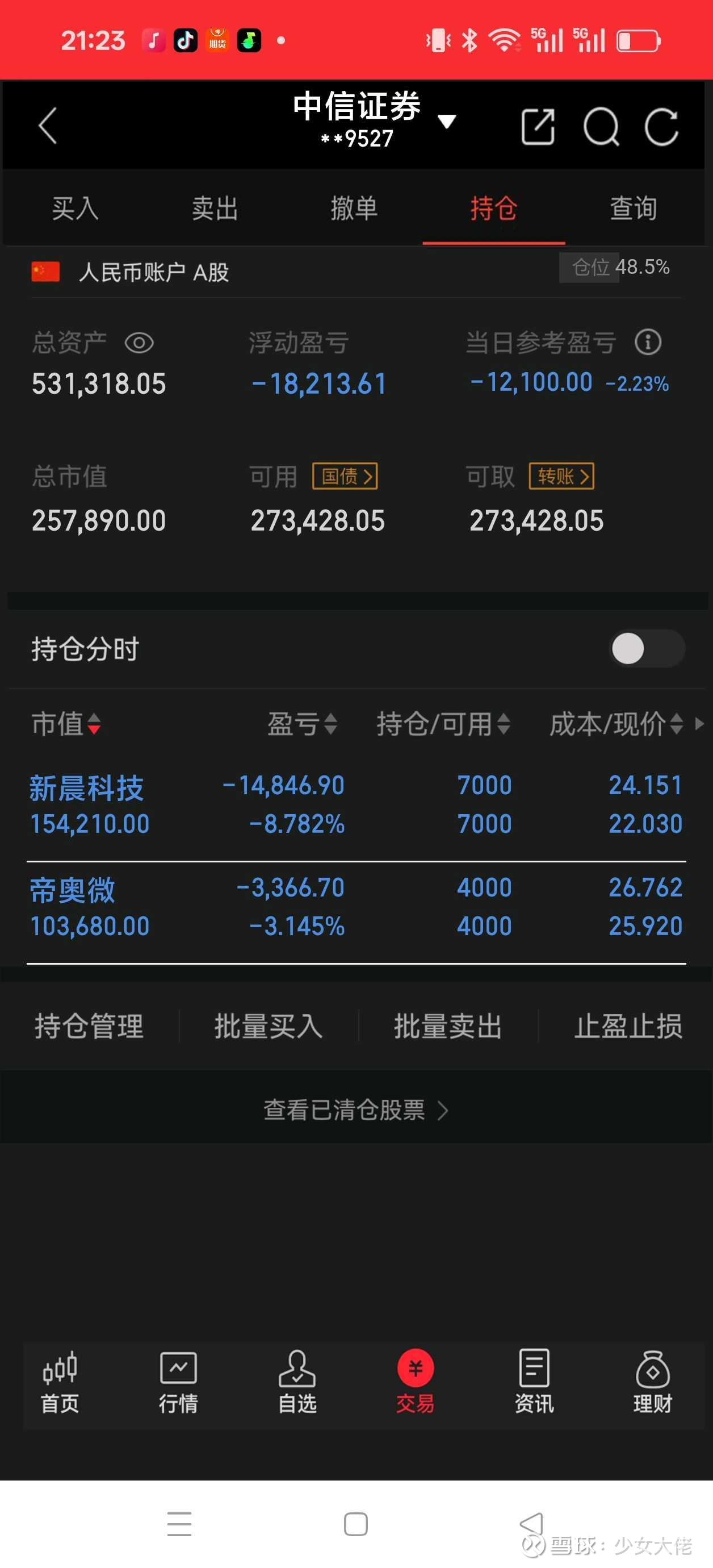 今天血亏啦,亏嘛了虽然一直有心理准备真的来了杀的我难受!今天没动,开盘就这个德行啥机会也没给,目前就持股没动一点都没变哈!前几天一直说了要注意风险控制仓位不能,也不说要跌多少只是这次大盘涨很多股票没涨,所以调整那可不一定能置身之外,这不雪上加霜?