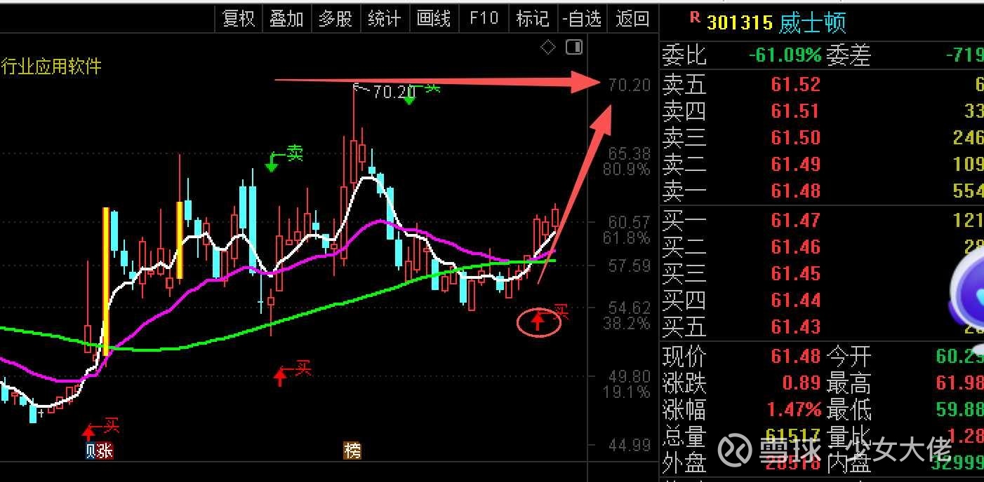这两天出门了,都忘记发文了,坚持下就过去了!目前持有$威士顿(SZ301315)$ 今天尾盘进的刚突破上涨趋势,这个周线好看,所以是大概率没问题,重点在于他是短期就拉还是在要横一下,短期看57.5-58附近的支撑,也有机会这两天就拉!