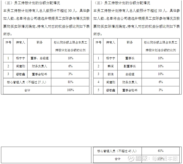 员工持股计划参与者仅限高管和核心管理人员九阳股份第一期员工持股计划的参与者只有公司高管和核心管理人员,包括董事长、副董事长、总经理、财务负责人、董事会秘书等,并且中途进行过变更,参与人数由最多不超过27人调整为最多不超过45人。