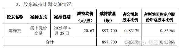 在两位控制人发布减持计划前两个月,联合精密的另一位大股东已经完成减持计划。根据联合精密2025年7月份发布的关于公司持股 5%以上股东股份减持计划期限届满的公告,公司原持股5%以上股东郑梓贤于2025年4月28日通过集中竞价交易减持89.77万股,减持价格为20.67元。据此计算,郑梓贤套现金额约为1855.55万元。