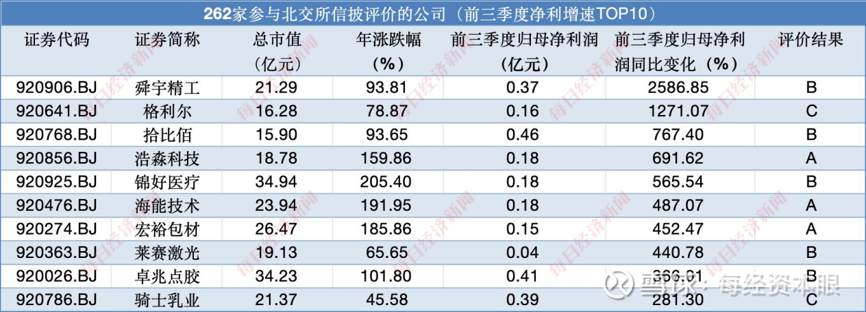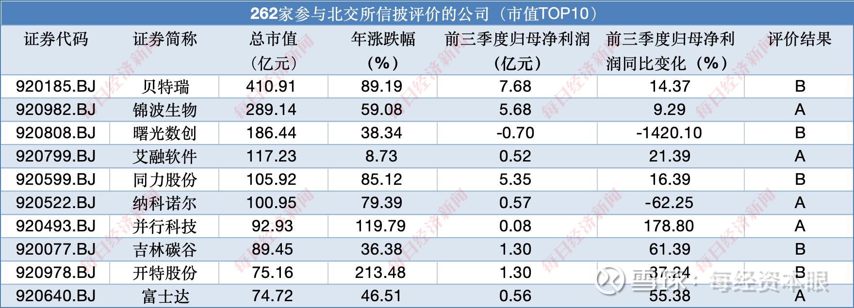 《每日经济新闻》记者根据Wind数据统计了此次参评的262家北交所公司发现,市值TOP10中,有5家获评A,5家获评B。