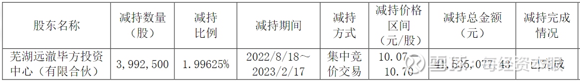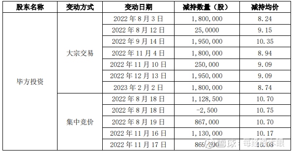 毕方投资第一次抛出减持计划时,距离其完成过户登记时间尚不足一年。相关公告显示,2022年8月18日至2023年2月17日期间,毕方投资通过上海证券交易所集中竞价的交易方式减持公司股份399.25万股,占公司总股本1.99625%,减持价格区间在10.07元至10.70元。