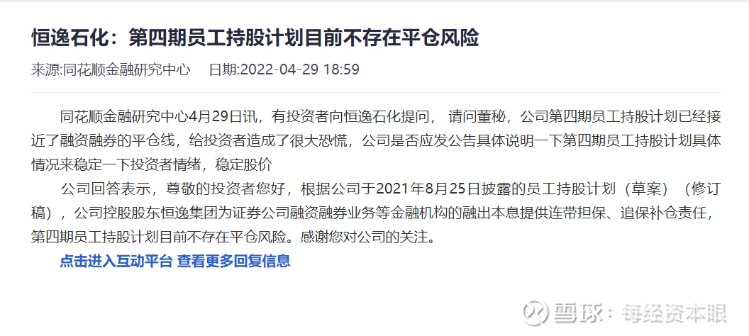 值得注意的是,2022年至2023年,由于恒逸石化股价表现低迷,期间最低价仅有2021年最高价的三成左右,在投资者互动易上,有投资者多次对恒逸石化第四期员工持股计划表示了担心。不过,公司表示,第四期员工持股计划不存在平仓风险。