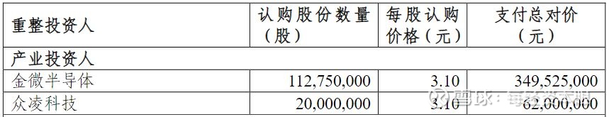 根据*ST聆达此前的重整计划公告,作为产业投资人,金微半导体和浙江众凌认购股份数量分别为1.1275亿股和0.2亿股,每股认购价格均为3.10元,支付总对价分别为3.49525亿元和0.62亿元。