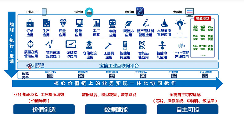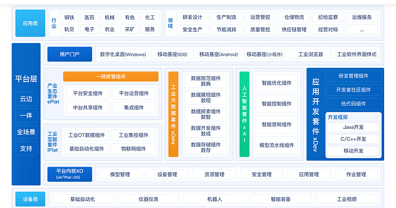 如果所有的种类都选上,大概有61个软件,当然有大有小,但是以宝信的人力(5000多个员工)来看,应该无法把每个产品都做到行业顶尖,大部分应该是根据工厂的需要开发的。真正做到产品级别的,是不多的。其中有一个产品看上去还不错,就是xIn³Plat工业互联网平台,官网展示的产品结构如下: