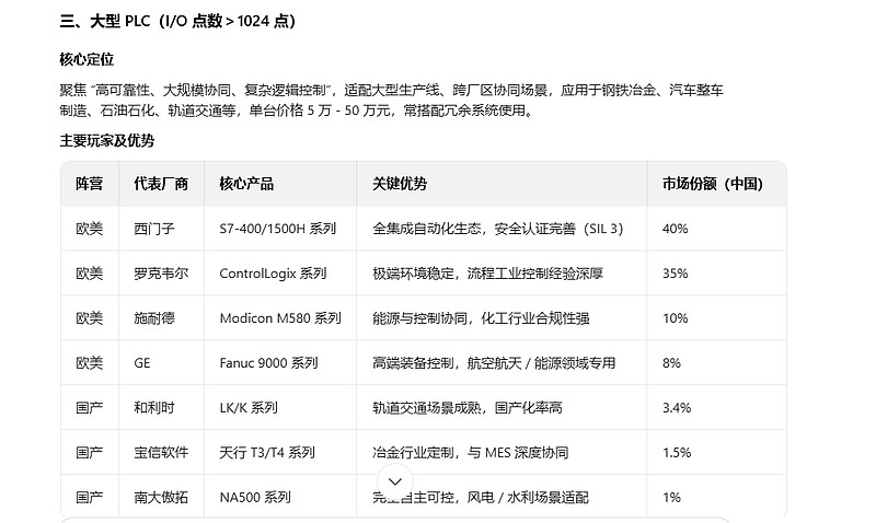 用AI查询了当前大型PLC的市场竞争情况,宝信的市场占有率较低: