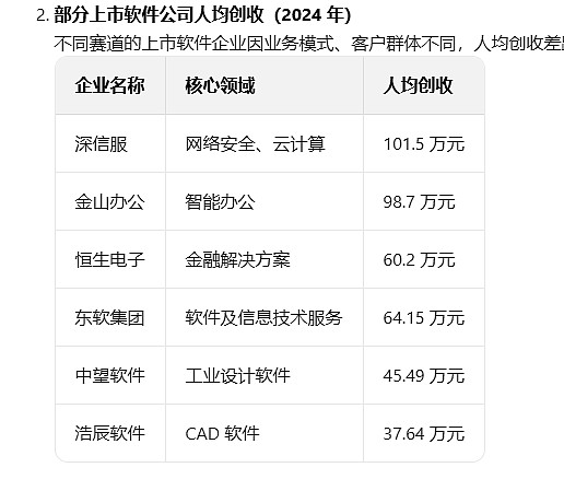 公司的人均薪酬支出42万,还是可以的,而人均利润达到40多万,这在软件行业是比较高的,剔除服务外包业务(IDC为主),人均软件和工程服务收入达到了165万,这个在软件行业里面还是比较高的,典型的软件公司的人均收入如下: