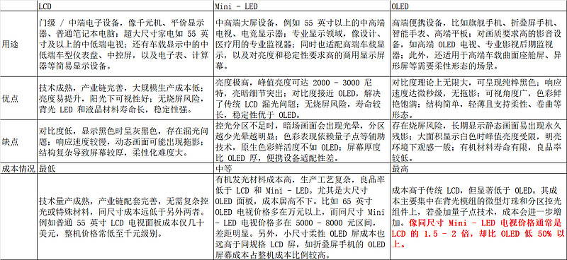 有三种:TFT-LCD,Mini-LED(后续向Micro-LED发展),OLED,三种技术各自的用途,优缺点,成本对比情况如下表: