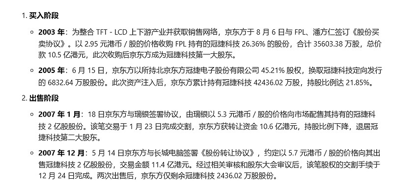 2003-01月:京东方 3.8 亿美元收购 HYDIS 产线(2 代 / 3 代 / 3.5 代产线)与技术,在韩成立全资子公司BOE-Hydis运营,产线位于韩国利川市,运气行,行业进入景气期,当月即盈利,当年累计盈利约 6000 万美元。