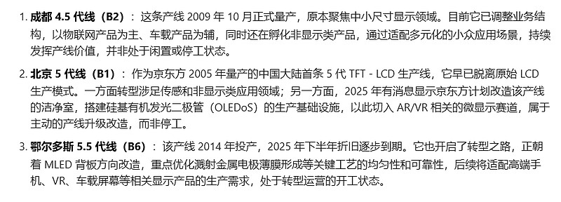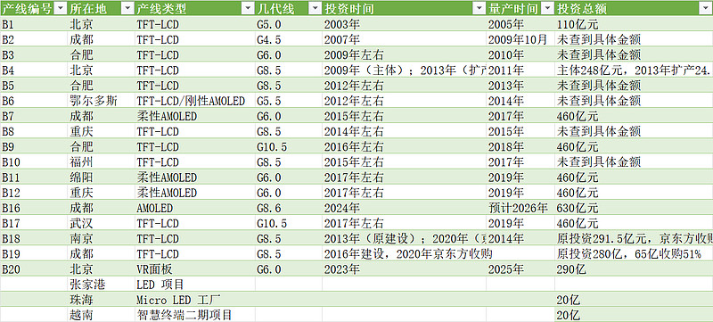 更高的代线的优势是生产效率、良率的提高外,还有一个切割效率,切割效率主要是针对大屏,比如现在的100寸的屏幕只有10.5代的可以切割,所以,高代线更适合生产大屏幕,对于小屏幕,低一点的代线也够用了。京东方的低代线还在开工: