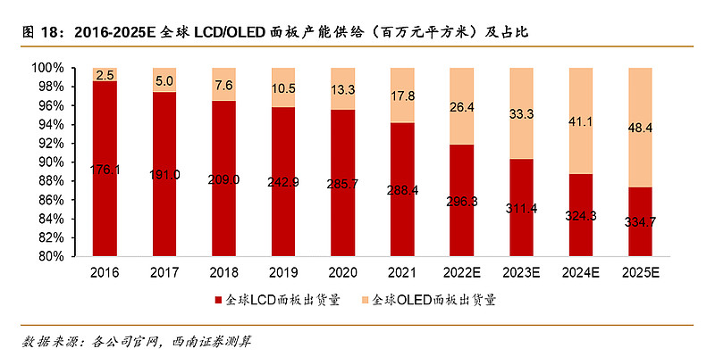 从占比看,LCD的产能逐年下降,但是绝对值还是远大于OLED。占比依然还有88%。