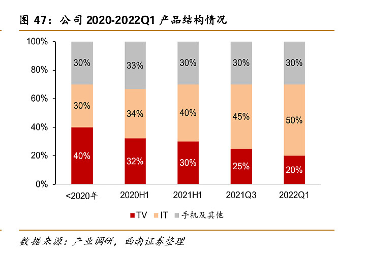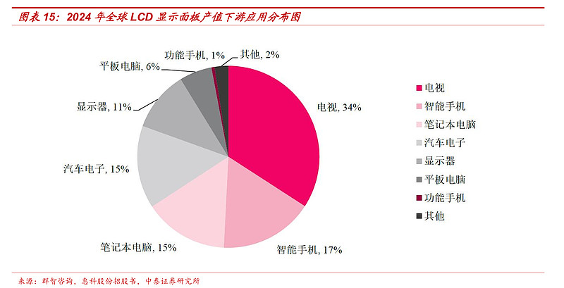 LCD面板的主要需求是电视、手机、NB、汽车电子、IT等,分布如下: