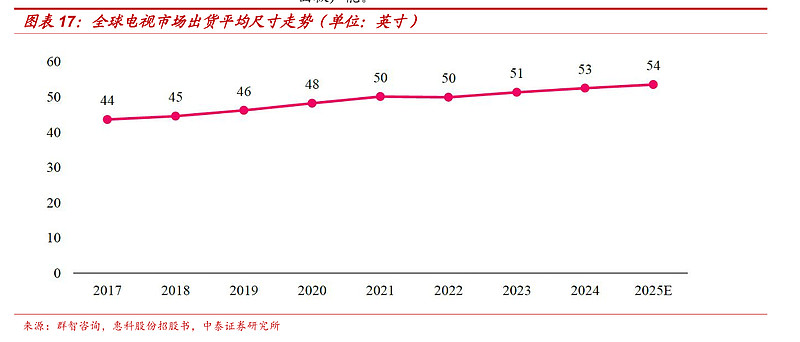 电视机行业的特点是平均每台电视的尺寸每年在增加,但是数量不再增加,全球LCD TV面板出货平均尺寸预计 将由2017年的43.5寸增长为2021年的48.6寸。