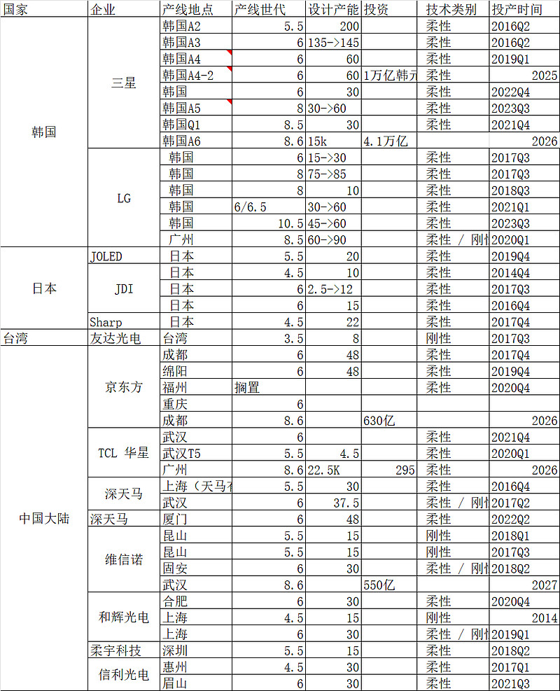 这个报告是从券商研报获取的,但是感觉有出入,我核对了三星,京东方和TCL的,其他的暂时不核对的,总体的来说,现在新建设的产能以OLED为主,三星的几条线路都是从原来的LCD产线改造的,所以,LCD到OLED的部分设备应该是可以共用的。