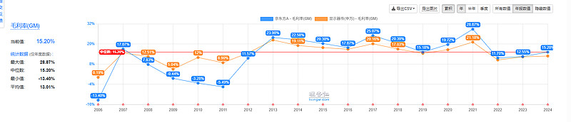 22、23年的毛利率较低。再看一些过去20年的毛利率趋势。