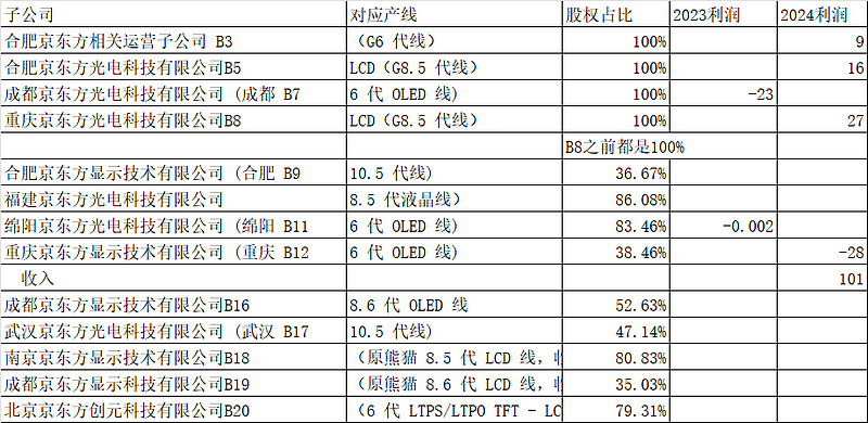 主要原因是一些成熟的盈利子公司是100%控股,而新投资的项目占比不是100%,但是亏损较大,由于京东方没有公布完整的子公司盈利情况,大概能够搜索到的数据如下: