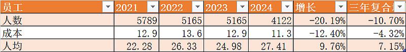 员工人数是逐年下降的,人均收入在提高。
