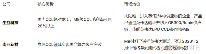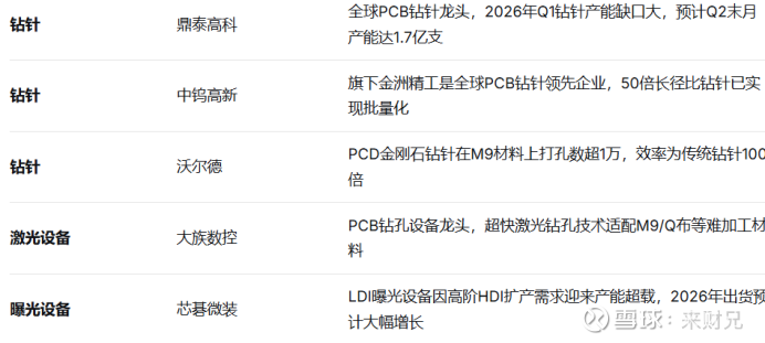 PCB产业链在电子布(菲利华、中材科技)、树脂(东材科技)、CCL(生益科技)、PCB制造(胜宏科技、沪电股份)、钻针(鼎泰高科)、加工设备(大族数控)等环节迎来重大机遇。