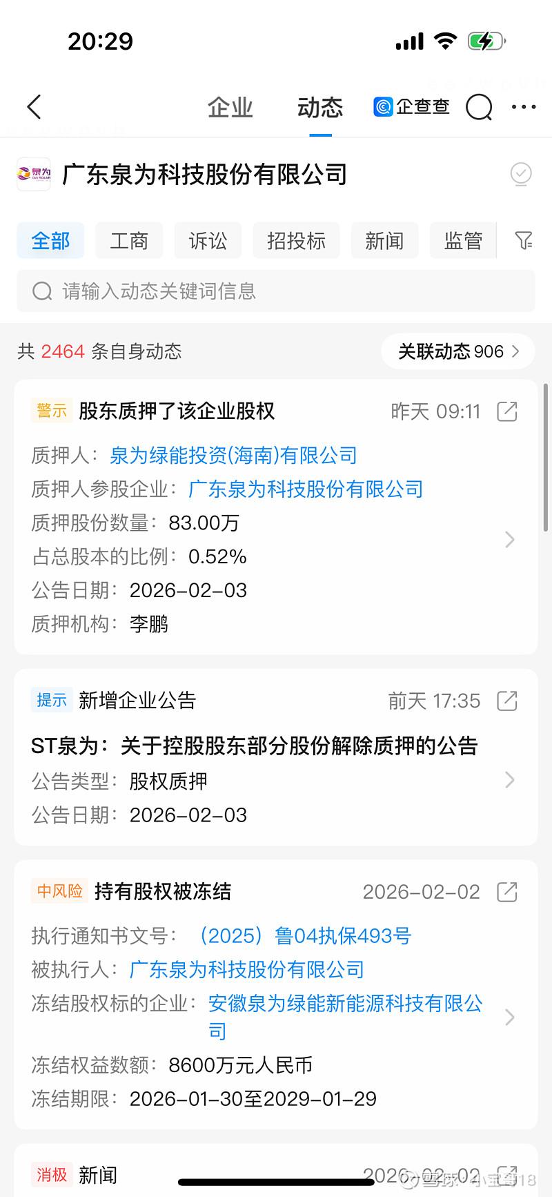 泉为近期拍卖汇总: 1、1月22日 北海银河供应链管理有限公司阿里资产平台开展的“ST泉为(证券代码300716) 830000股”项目公开竞价中,以最高应价胜出, 7人报名 N轮报价 8785280成交,成交每股单价10.58 对应当天股价:12.01: ; 2月2日 卢闯在阿里资产平台开展的“ST泉为(证券代码:300716)500万股股票”项目公开竞价中,以最高应价胜出。该标的网络拍卖成交价格:¥53280000 成交每股单价: 10. 656, 对应当天股价:12.91。 若本次司法拍卖完成过户登记,泉为绿能持股将由15,272,000股减少至10,272,000股,占公司股本的比例将由9.54%降至6.42%。公司将持续关注该事项的进展,依法履行信息披露义务,敬请广大投资者注意风险。