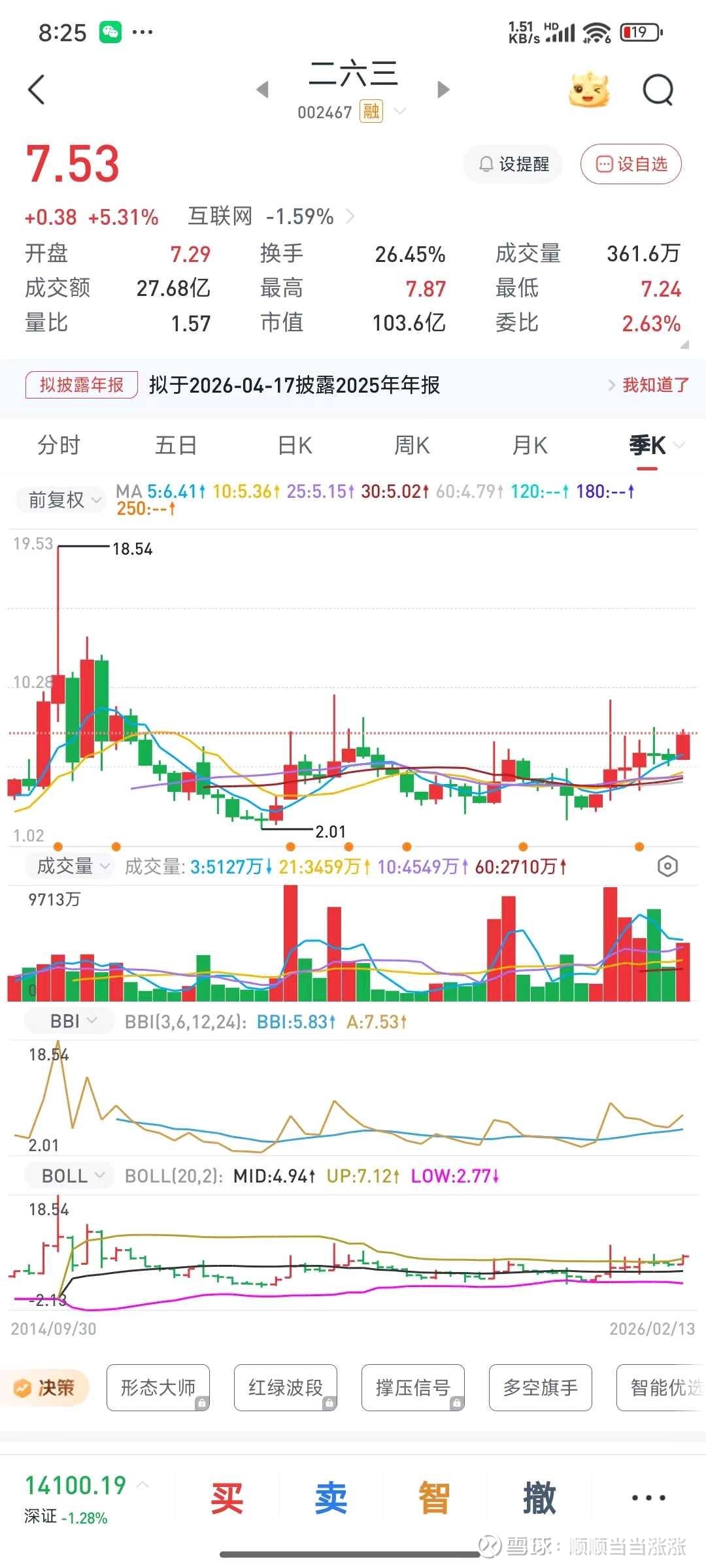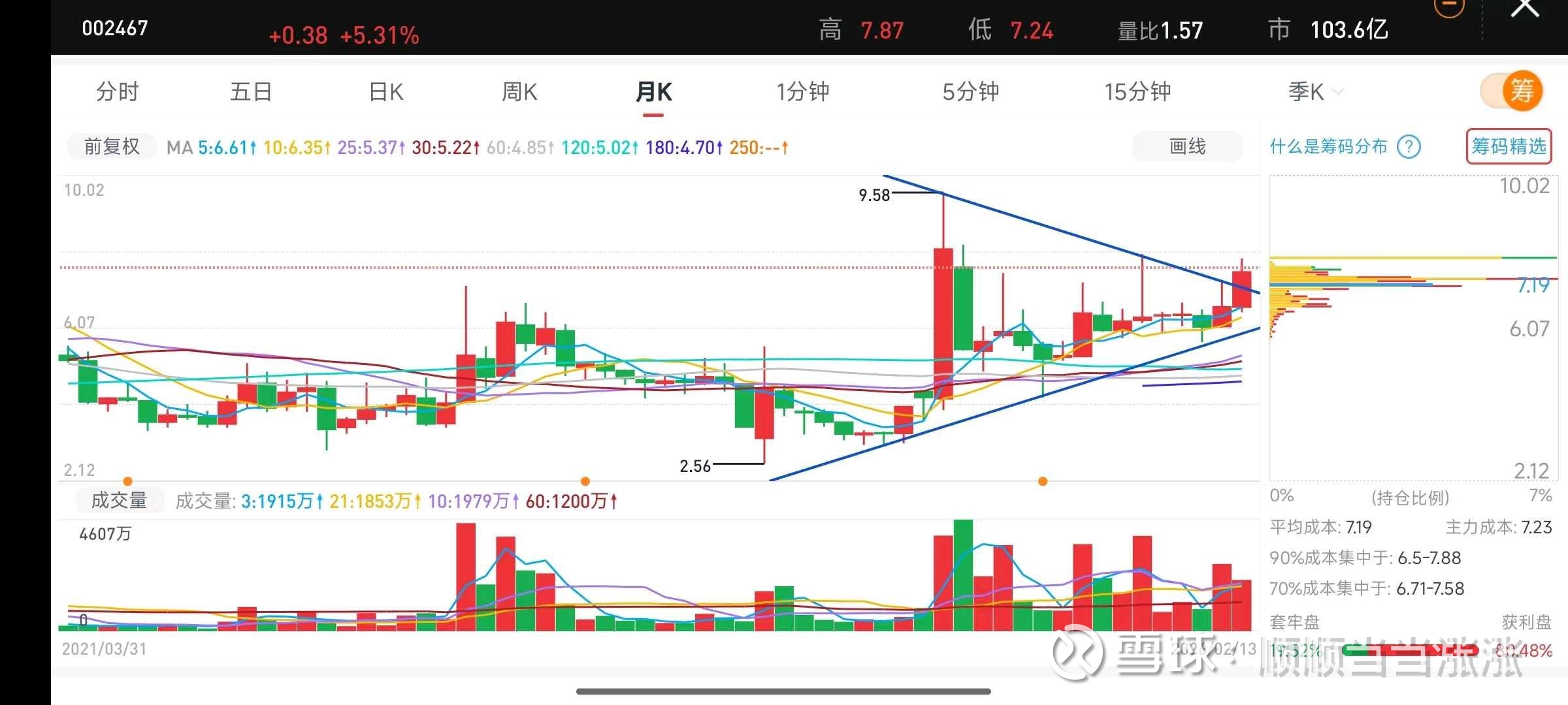 可以看到,二六三的月线和季度线都处于三角形整理末端,春节前最后一个交易日冲击涨停,收盘价为7.53元,已经突破上方月线趋势压力位。当日换手26%,龙虎榜现顶级游资方新侠。$二六三(SZ002467)$ $智谱(02513)$