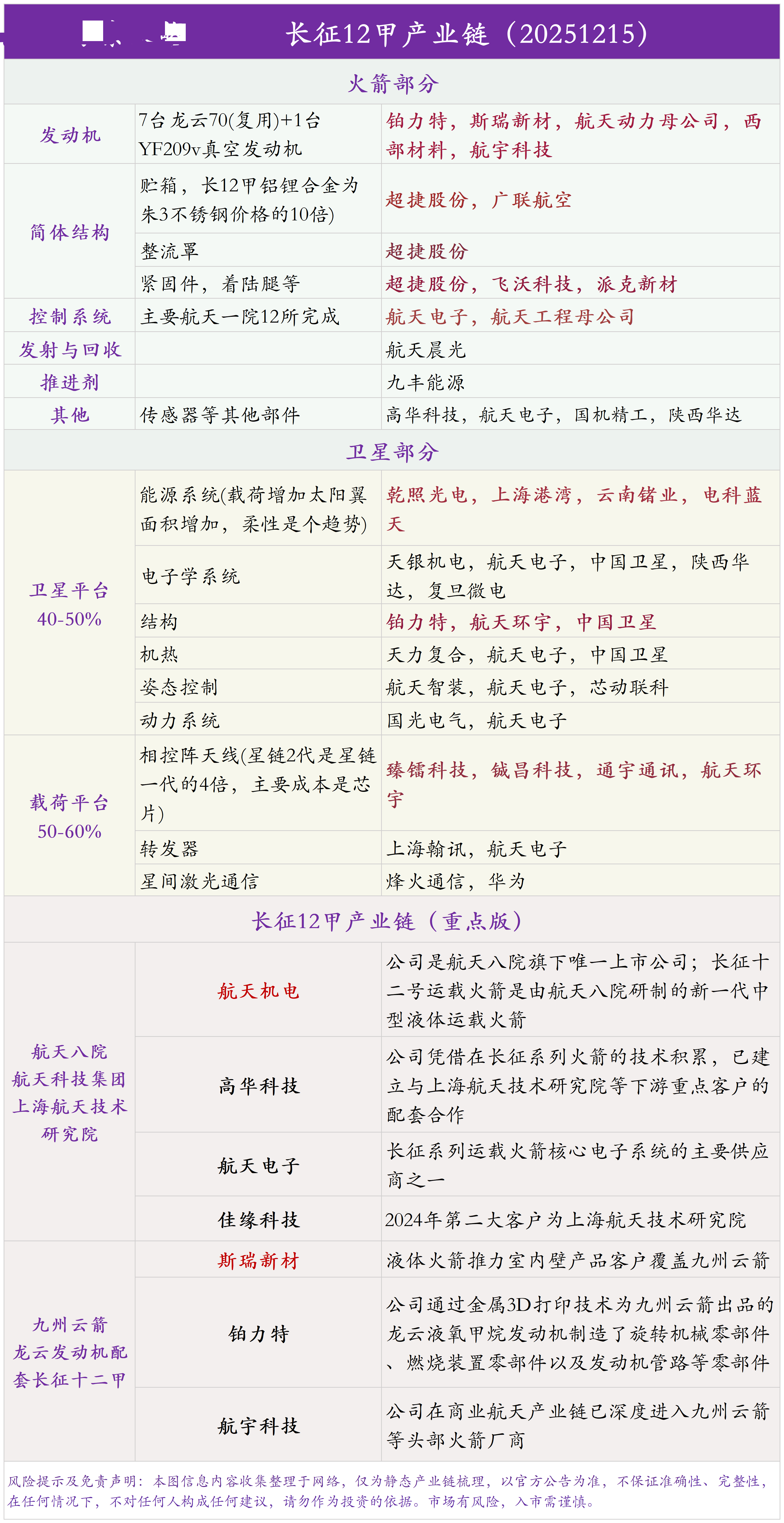 短期博弈点: 长征12甲预计12月中旬首飞(以官方为准)。