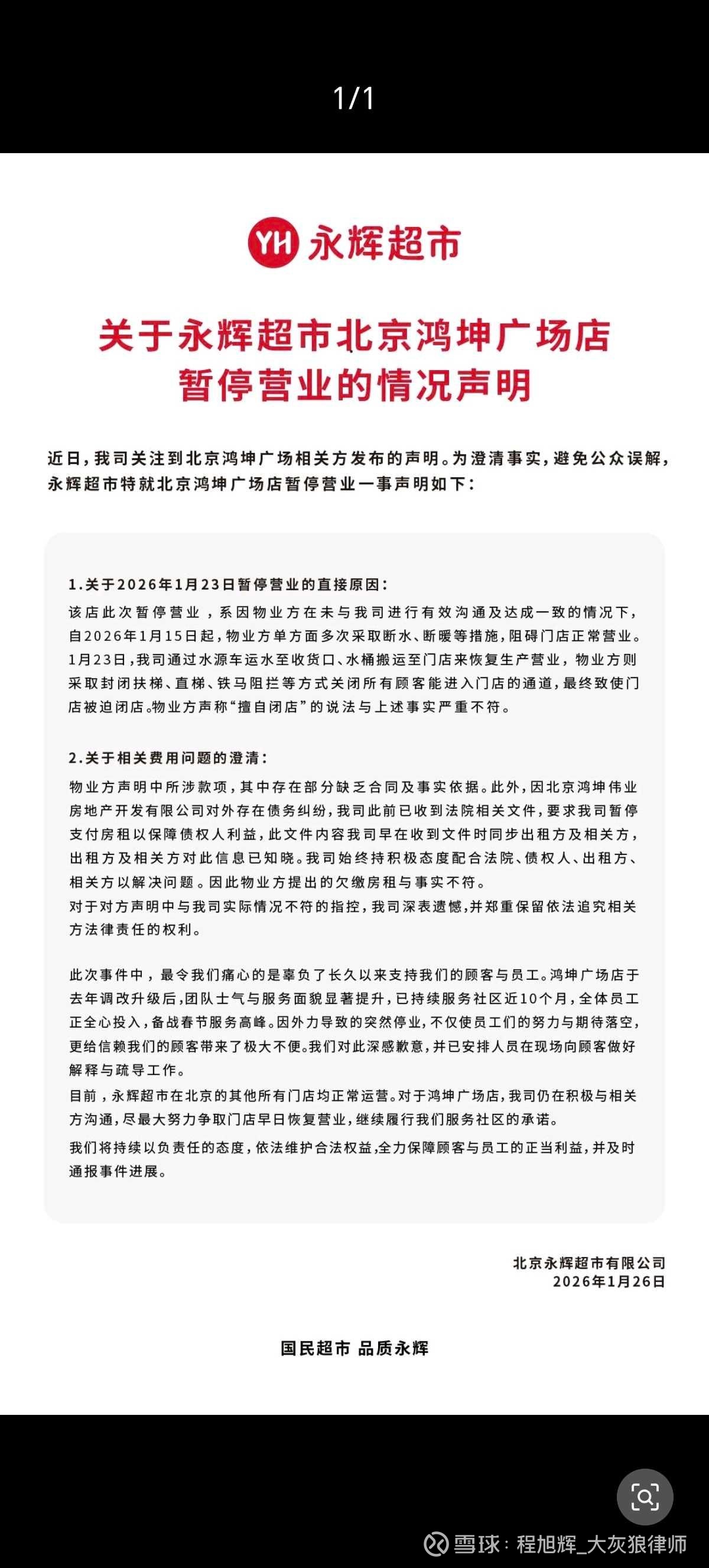 吃瓜就行了。$永辉超市(SH601933)$ 晚上就发了说明,对比下鸿坤的,哪个真假比较容易判断。一是鸿坤集团现在有大量失信和债权人申请破产申请,二是没那个超市会傻到自断财路,放弃春节前后一个月超级黄金暴利期。那个地方的鸿坤广场基本靠永辉引流,招商不及格。这下互掐,永辉五公里内还有三家正常营业超市,可惜那个综合体可能就废了。查看图片