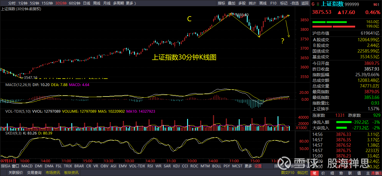 对于上证指数,前面的文章说的很清楚。从上证指数30分钟K线图分析,如果30分钟直接涨上去,就是上升趋势的延续。如果跌下来就是构造一个30分钟中枢震荡。到底选择哪种走势,谁也不知道,只能让市场自己选择。我们只需要知道一点:无论涨跌都无所谓,都是正常的技术走势。因此你安心持股即可。