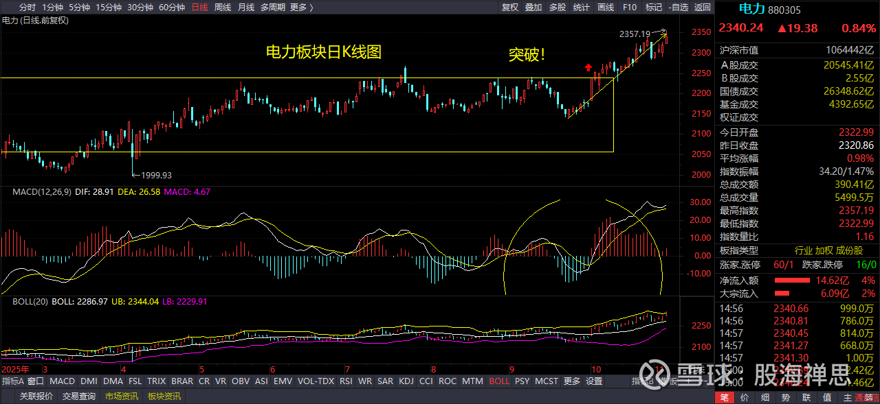 电力板块和当初的分析一致,突破中枢顶之后开启了新的一轮上涨趋势。虽然会有震荡,但趋势很难改变。未来依旧会保持向上趋势直至出现新的中枢。
