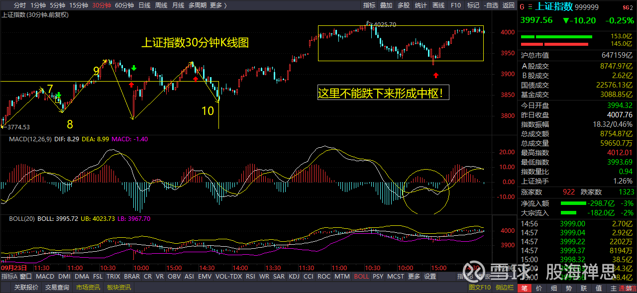 从上涨指数30分钟级别走势看,当下的指数可以横盘震荡但最终必须选择向上突破。这个位置不能再走向下的趋势,否则这个位置机会构造出新的30分钟级别中枢。而这里构造中枢显然会形成趋势顶背离,导致股指再度跌入上一个中枢内。