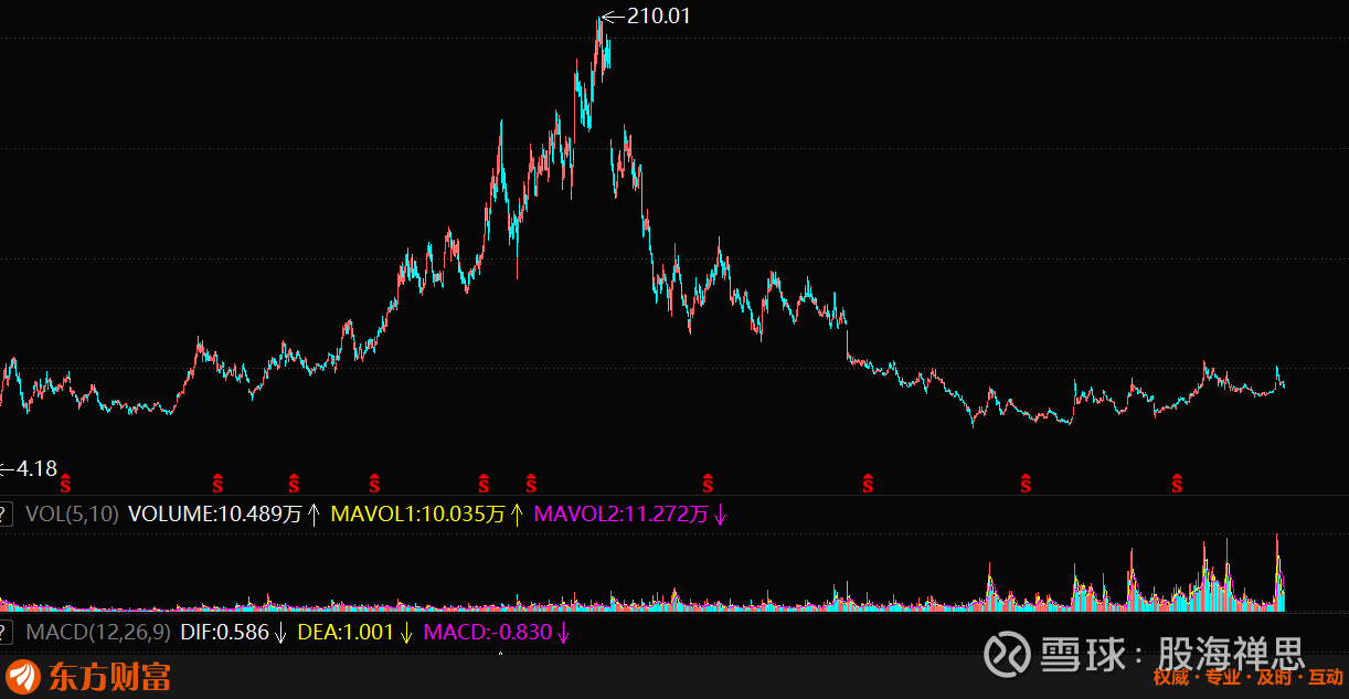 这是我给大家推荐的股票中的一只,你看股价从210元跌至22元。我们依旧假设资产价格可以循环,那么它从最低价回到历史峰值可以涨10倍。而在底部区域,无数的巨量成交已经成为股价护城河,理论上要再跌至22元概率极低。其实大家如果看这只股票的前半段,你就能体会那210元买入后跌至22元的痛苦了。