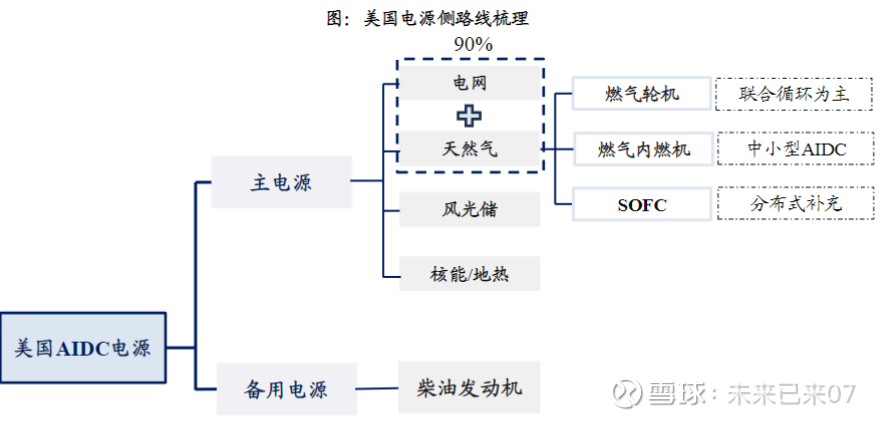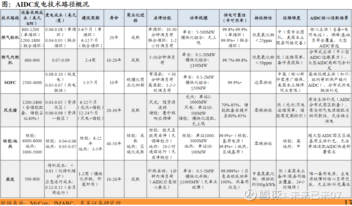 北美缺电投资逐渐从燃气轮机向燃气内燃机、SOFC扩散,当前北美缺电量仍大于各种技术总产能供应,因此该板块尚未到达选择技术路径的阶段,各类技术路径的相关 投资机会都应重视。综合考虑成本、建设周期、环保等因素,燃气轮机是当前AIDC自建电最优解,燃气内燃机、SOFC、柴发为有效补充。