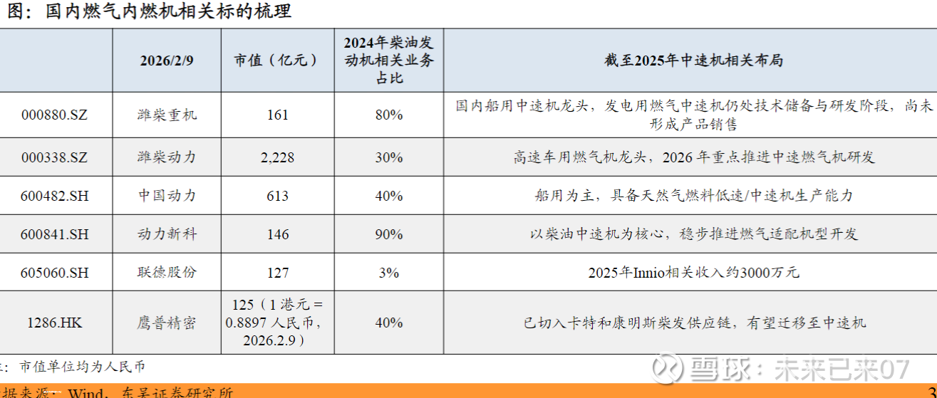 2)燃气内燃机 燃气内燃机在发电效率上略低于联合循环燃机,但胜在快速交付与部署,龙头瓦锡兰2025Q1- Q3新签设备订单同比增长111%,订单交付排至2028年。燃气内燃机竞争格局由卡特彼勒、 康明斯、MTU、颜巴赫、瓦锡兰、曼恩等外资主导。 国内企业暂无直接供应美国的主机厂,但可以关注柴油发动机相关主机厂,通过产品改制验证后有望切入中速机市场,如潍柴重机、潍柴动力、中国动力、动力新科;零部件方面,关 注联德股份(Innio供应商)、鹰普精密(卡特彼勒与康明斯柴发供应商)。