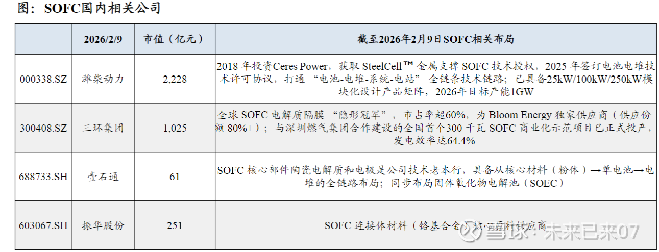 3)SOFC SOFC热电联供发电效率虽高,但当前商业化和成本控制处于初期阶段,度电成本和产能释放 导致该技术短期无法成为主流线索。其核心优势目前在于建设周期仅约0.25–0.5年,可在缺电 地区实现即装即用、就地供能。 SOFC市场由BloomEnergy垄断,BE预计26年产能达2GW。国内相关公司如潍柴动力,对标BE,26年规划产能1GW。三环集团电解质隔膜全球垄断,绑定BloomEnergy。