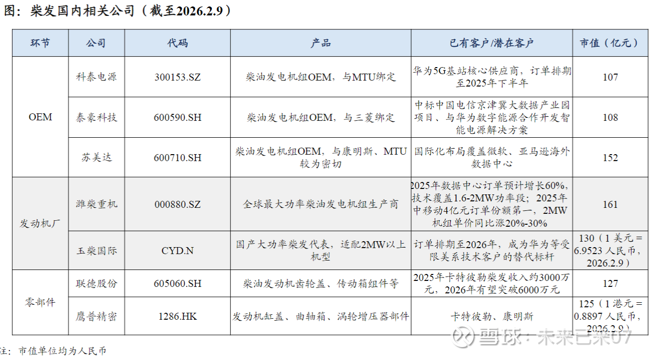 4)柴油发电机 柴油发电机组具备快速启停优势,备用电源最优解,龙头公司康明斯2025年Q1-Q3相关收入 同比增速约20%。 映射到A股的投资机会分为两个思路,一是从北美映射角度出发,选择国内柴发相关标的,如 OEM商科泰电源、泰豪科技、苏美达,以及发动机厂潍柴重机、玉柴国际;二是选择卡特/康 明斯的供应链,如联德股份、鹰普精密。