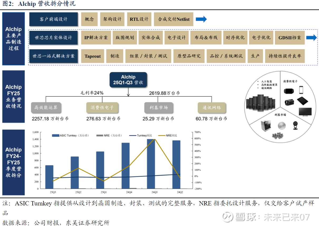 2)复盘台系ASIC产业链崛起路径 世芯-KY(Alchip)从早期受托ASIC/SoC设计,逐步演进为覆盖前后端设计、流片协调、封 装测试、量产导入与良率改善的Turnkey一站式平台,并在AI/HPC周期中进一步强化3nm、 2nm、3DIC与先进封装能力,推动商业模式从接案型设计服务升级为平台型ASIC合作伙伴, 其业绩和股价弹性也因此与大客户项目节奏、先进制程导入与封装产能约束高度相关