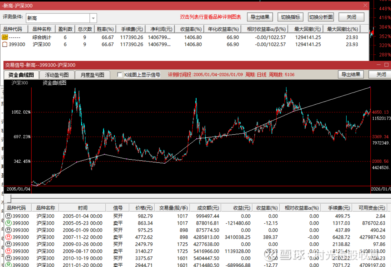 比如说,120日新高买入,回撤17%卖出的交易系统,如图所示,就是这个公式用来交易沪深300的结果了。可以看到,相对沪深300有着较高的超额收益。交易胜率66.67%。收益率1406%,超过区间涨跌幅384.23%。