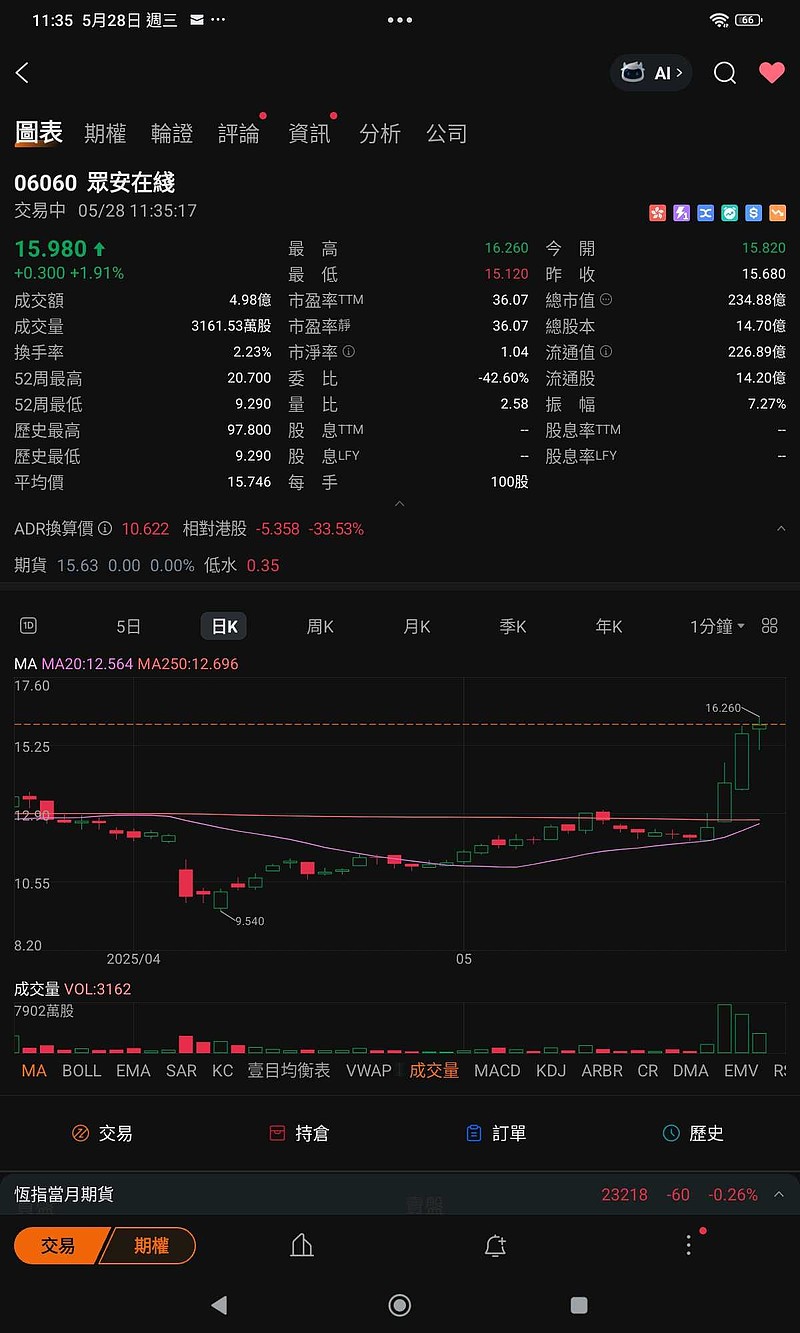 眾安在缐,和手回做同一樣业务,这兩三天在升,是不是反映手回会升!但在