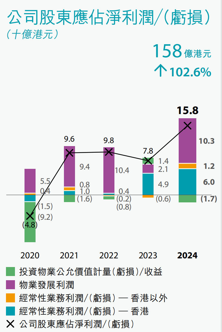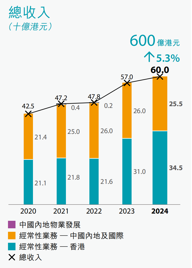 2022-2024财年,三年平均收入 549.35亿 HKD,平均利润 111.28亿HKD,平均每股分红 1.31 HKD(而且这三年是一样的);而十年前的2012-2014财年,三年平均收入 382亿 HKD,平均利润 140亿 HKD,平均每股分红 0.92 HKD。