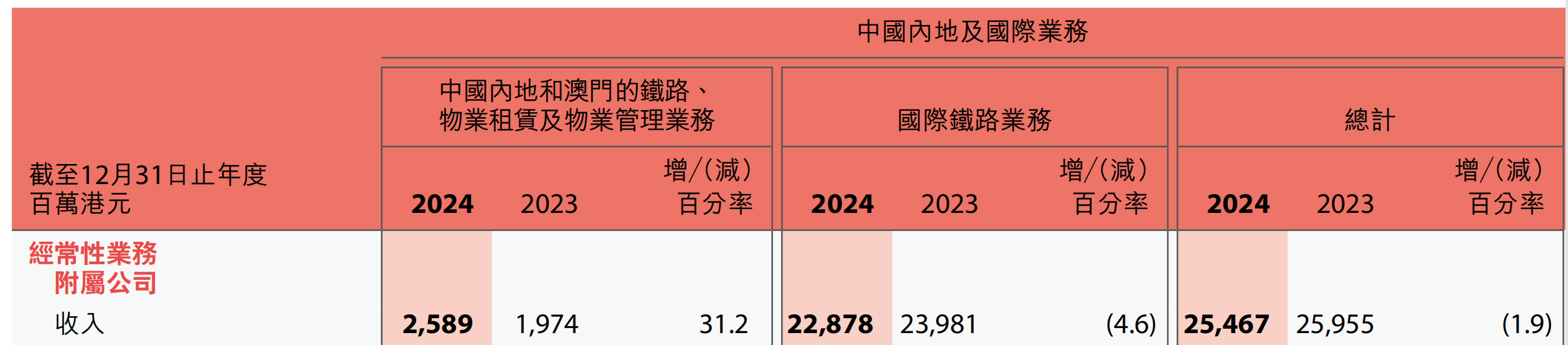 在香港之外的业务里面,国际铁路业务占据了90%+,而内地和澳门的铁路、物业租赁、物业管理业务加起来也只有10%-。