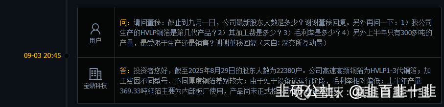 公司高速高频铜箔为HVLP1-3代铜箔;加工费因不同型号、不同厚度铜箔差别较大;由于处于设备试运行阶段,毛利率相对偏低;上半年产量369.33吨铜箔主要为内部板厂使用。