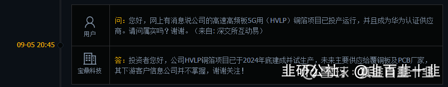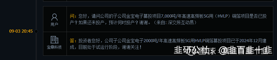 公司子公司金宝电子2000吨/年高速高频板5G用HVLP铜箔募投项目已于2024年12月建成,目前处于试运行阶段,谢谢关注!