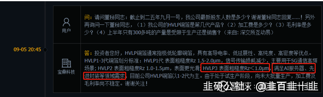 HVLP铜箔通常指极低轮廓铜箔,具有高导电率、低延展性、高纯度、高密度等优点。HVLP1-3代铜箔划分标准:HVLP1代 表面粗糙度Rz 1.5-2.0μm,信号传输损耗减少,主要用于5G通信高频场景; HVLP2 表面粗糙度Rz 1.0-1.5μm,表面更光滑; HVLP3 表面粗糙度Rz<1.0μm,满足AI服务器、先进封装等领域需求,目前公司HVLP铜箔以1-2代为主。由于处于试生产阶段,尚未大批量生产,加工费及毛利率尚不稳定。谢谢关注!