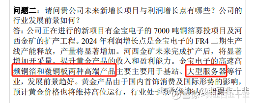 公司正在进行的新项目有金宝电子的 7000 吨铜箔募投项目及河西金矿的扩产工程。2024 年利润增长点是金宝电子的 FR4 二期生产线产能释放,产量将显著增加。河西金矿未来完成扩产后,将显著增加开采量、提升黄金产品的收入和盈利能力。金宝电子的高速高频铜箔和覆铜板两种高端产品主要主要用于基站、大型服务器等行业,发展前景趋好。黄金产品由于国内首饰消费及国际形势的影响,预计黄金价格也将维持高位运行,行业处于景气周期内。