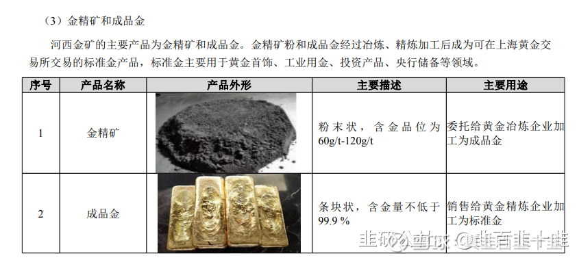 河西金矿的主要产品为金精矿和成品金。金精矿粉和成品金经过冶炼、精炼加工后成为可在上海黄金交易所交易的标准金产品,标准金主要用于黄金首饰、工业用金、投资产品、央行储备等领域。