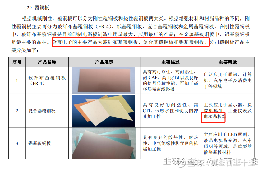覆铜板可以分为刚性覆铜板和挠性覆铜板两大类。根据增强材料和树脂品种的不同,刚性覆铜板主要可分为玻纤布基覆铜板(FR-4)、纸基覆铜板、复合基覆铜板和金属基覆铜板。在刚性覆铜板中,玻纤布基覆铜板是目前印制电路板制造中用量最大、应用最广的产品;在金属基覆铜板中,铝基覆铜板是最主要的品种。金宝电子的主要产品为玻纤布基覆铜板、复合基覆铜板和铝基覆铜板。