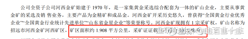 公司全资子公司河西金矿始建于 1970 年,是一家集黄金采选综合配套为一体的矿山企业,主要从事黄金矿的采选及销 售业务,主要产品为金精矿和成品金。河西金矿开采历史悠久,曾获得“全国黄金行业优秀企业”“全国黄金行业统计先进单位”“山东省金星企业”等荣誉称号。河西金矿现拥有 1 宗采矿权,矿山名称为招远市河西金矿河西矿区,矿区面积约 1.908 平方公里,采矿证证载生产能力 30 万吨/年。