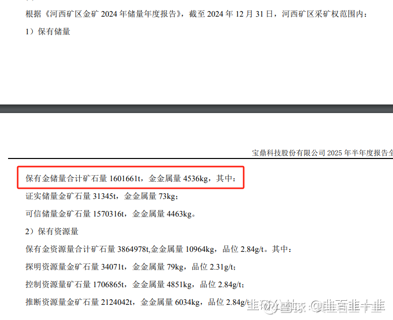 保有金储量合计矿石量 1601661t,金金属量 4536kg,其中:证实储量金矿石量 31345t,金金属量 73kg;可信储量金矿石量 1570316t,金金属量 4463kg。